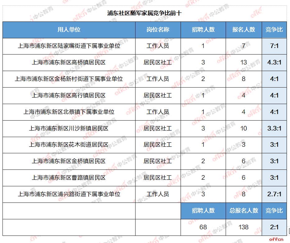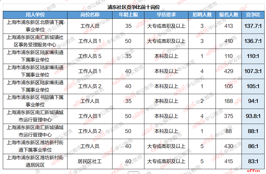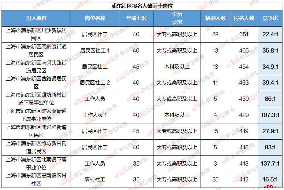 一、上海浦东社区竞争比前十岗位一览