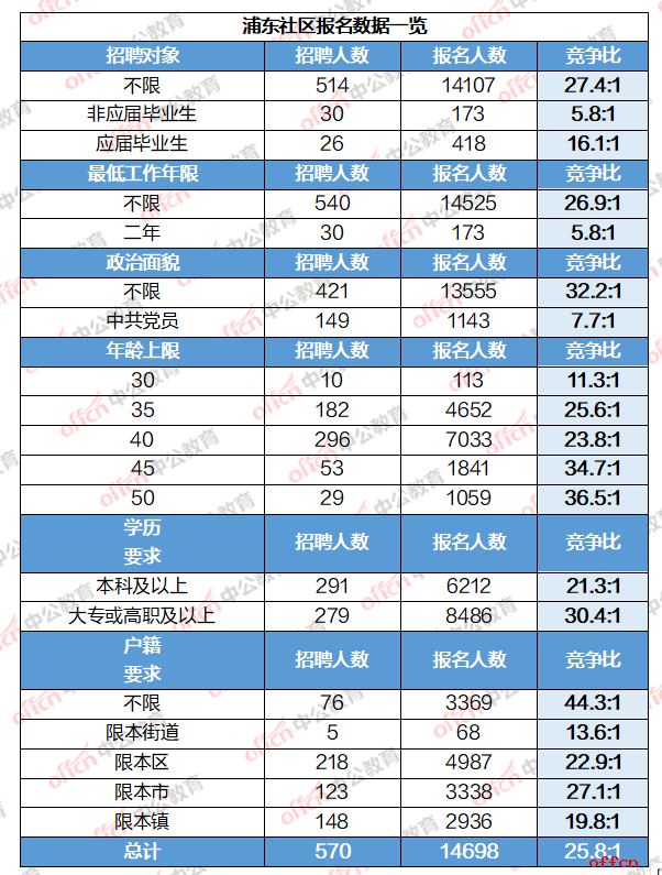 2025上海浦东新区社区工作者招638人!普通岗 570人(应届生不限户籍)+ 随军家属专项68人(学历放宽至大专)已于7日开始报名!现上海中公教育汇总16时报名数据帮助考生了解最新竞争比情况,截止16时上海社区总报名人数14698人竞争比最高岗位为上海浦东新区北蔡镇下属事业单位工作人员岗位总招聘3人已报名413人,竞争比为137.7:1