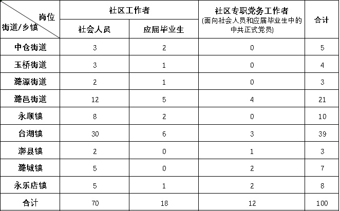 全区计划面向社会公开招聘社区工作者100人。其中:社区工作者88人(社会人员70人,应届毕业生18人);社区专职党务工作者12人。每人限报一个街道/乡镇的一个岗位。定向招聘人数不足时,可在报考本街道/乡镇内进行岗位调剂。
