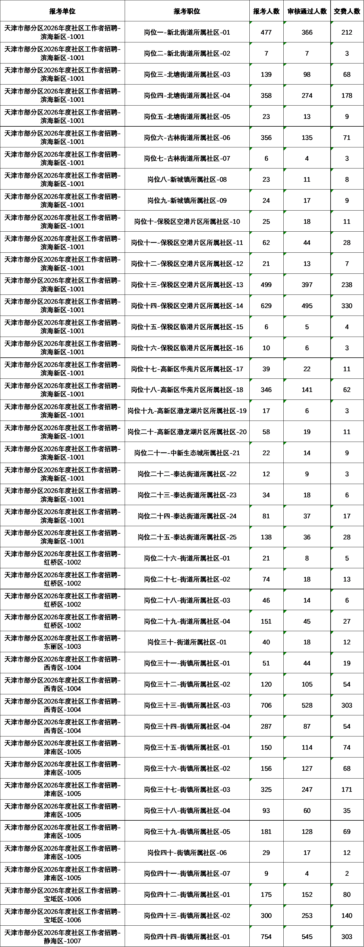 原标题:天津市部分区2026年度社区工作者招聘报考情况统计(统计时间:2026年1月22日上午10点)