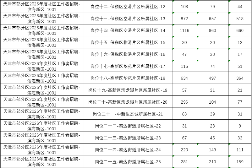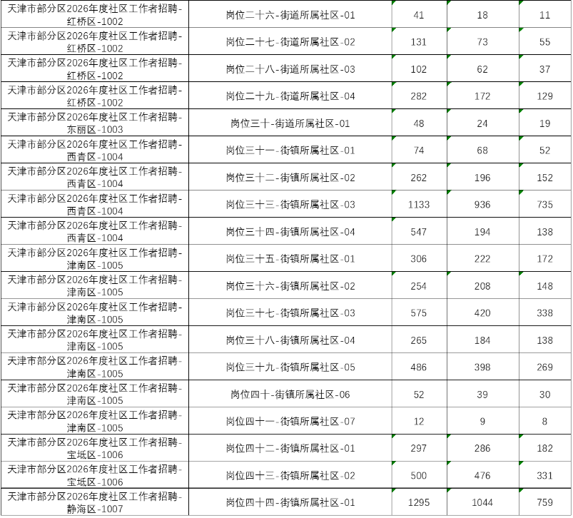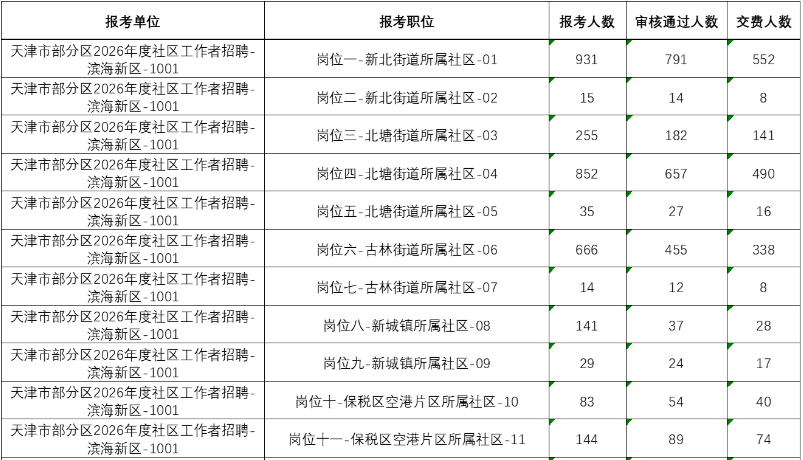 原标题:天津市部分区2026年度社区工作者招聘报考情况统计(统计时间:2026年1月22日上午10点)