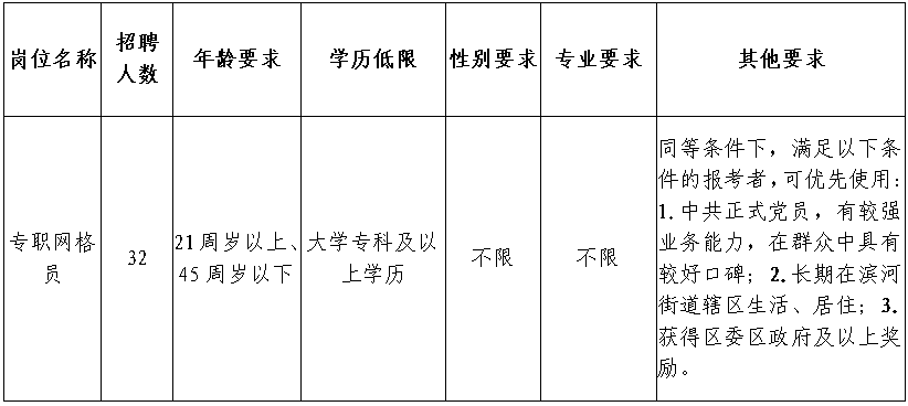 本次计划公开招聘专职网格员32名。报考人员在报名阶段可填报意向服务社区,最终社区分配将结合街道工作实际、报名总体情况及个人报考意向,综合研究确定。