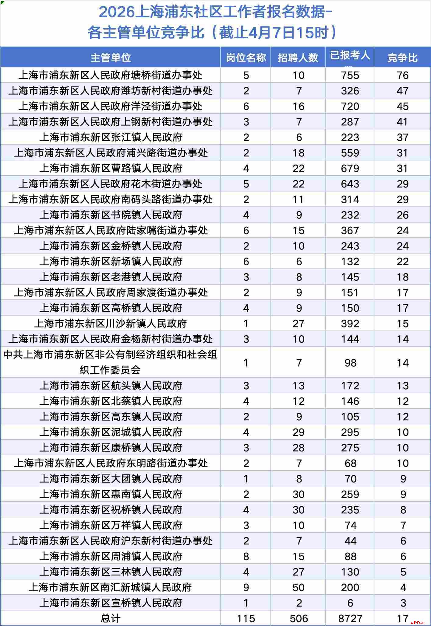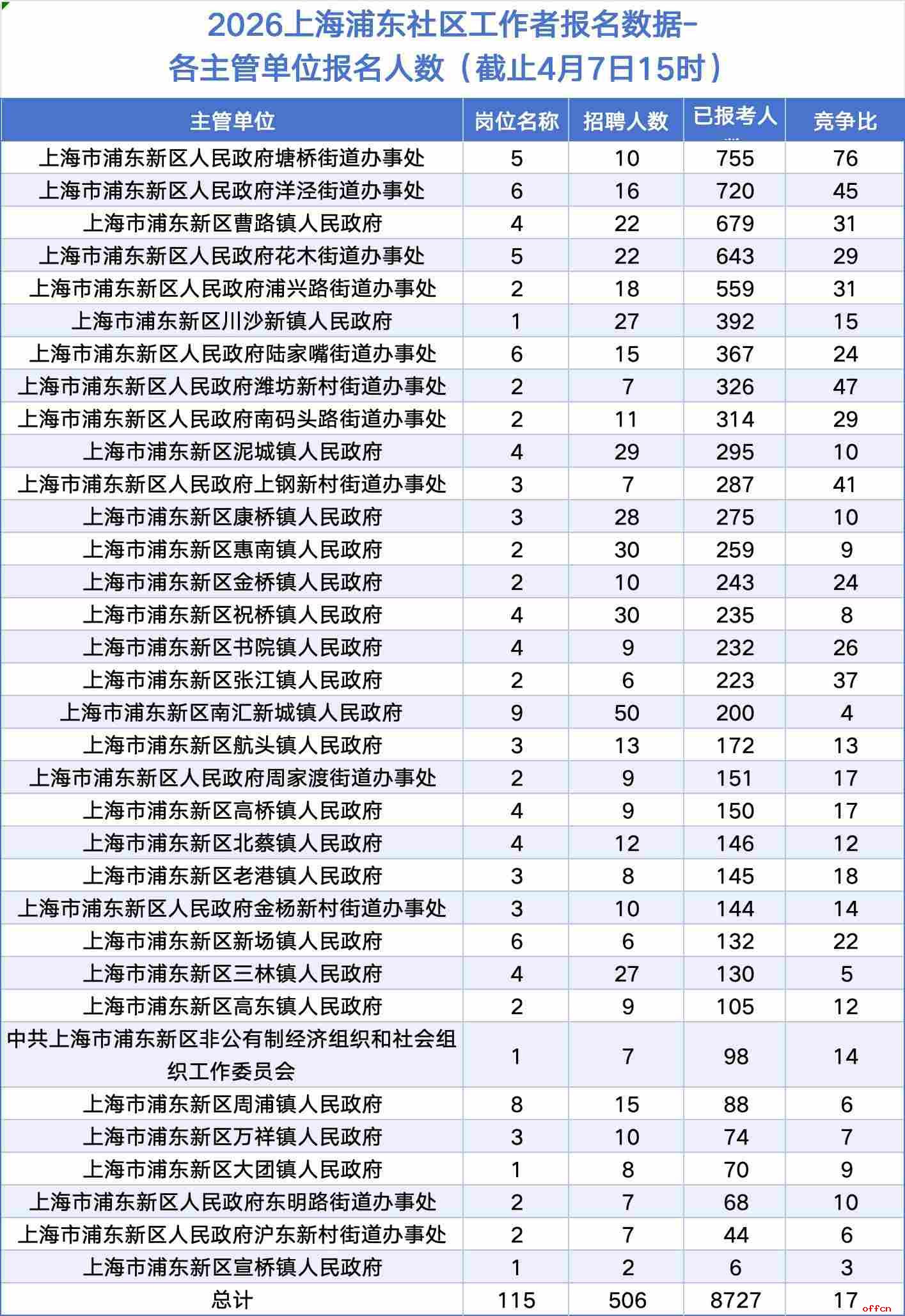 2026年上海浦东新区社区工作者招聘报名自4月3日10:00启动,至4月10日16:00截止。截至4月7日15时,报名时间刚刚过半,官方数据显示已有8727人成功报名,而总招聘人数仅为506人,整体竞争比达到17.25:1。这意味着平均每个岗位有超过17人争夺。