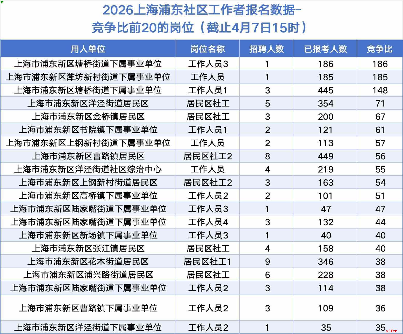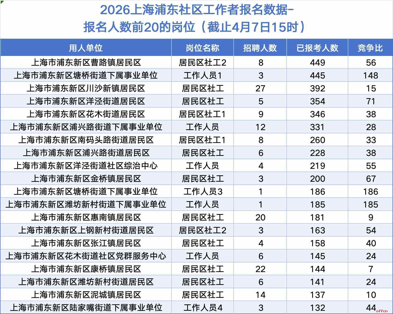 值得注意的是,报名人数最多的岗位并不一定竞争最激烈。曹路镇居民区社工2岗位招聘8人,报名449人,是报名人数最多的岗位,但竞争比约为56:1;川沙新镇居民区社工岗位招聘27人,报名392人,竞争比约为14.5:1,反而相对温和。这说明,大招聘量的岗位虽然报名人数多,但未必是竞争最惨烈的。