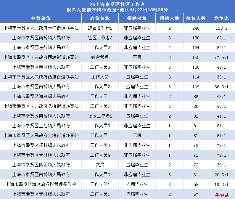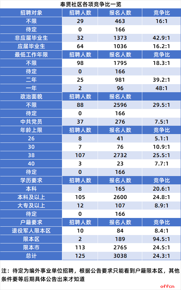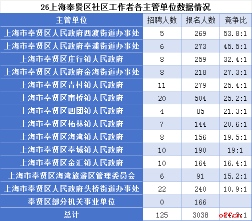 各位考生,2026年上海市奉贤区社区工作者正在进行中,总招聘125人,总报名3038人,整体竞争比约24.3:1。在岗位选择日益成为关键环节的当下,单纯埋头复习已不足以应对激烈的竞争——读懂数据、选对赛道,往往能起到事半功倍的效果。