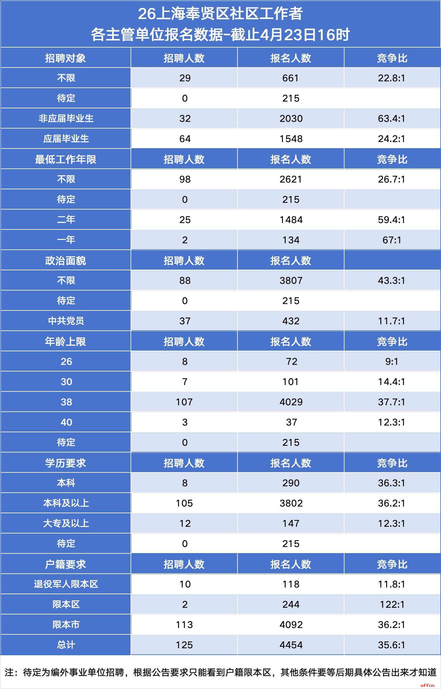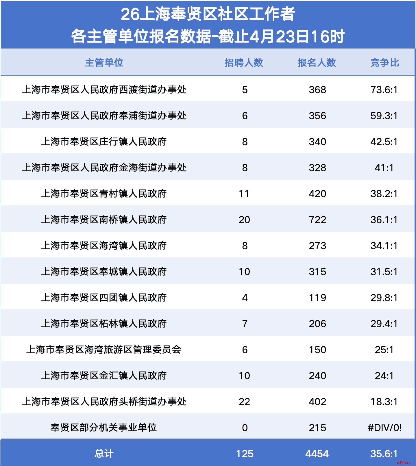 各位考生,2026年上海市奉贤区社区工作者正在进行中,总招聘125人,总报名约4454人,整体竞争比约35.6:1。在岗位选择日益成为关键环节的当下,单纯埋头复习已不足以应对激烈的竞争——读懂数据、选对赛道,往往能起到事半功倍的效果。