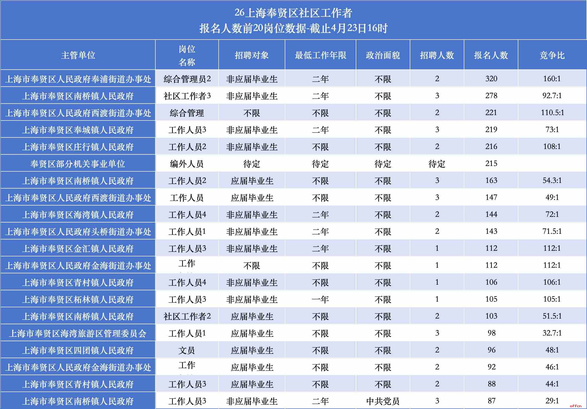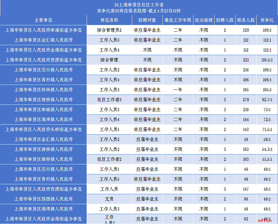 1. 报名人数最多 & 竞争比最高:奉浦街道“综合管理员2”