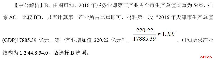 2.【答案】 B。中公解析:根据材料第二段文字“全年一般公共预算收入2723.46亿元,增长10.0%。全年一般公共预算支出3700.68亿元,增长6.3%”,可知一般公共预算由收入和支出混合,其增长率应介于6.3%~10.0%之间,排除AD,由支出值3700.68>收入值2723.46,
